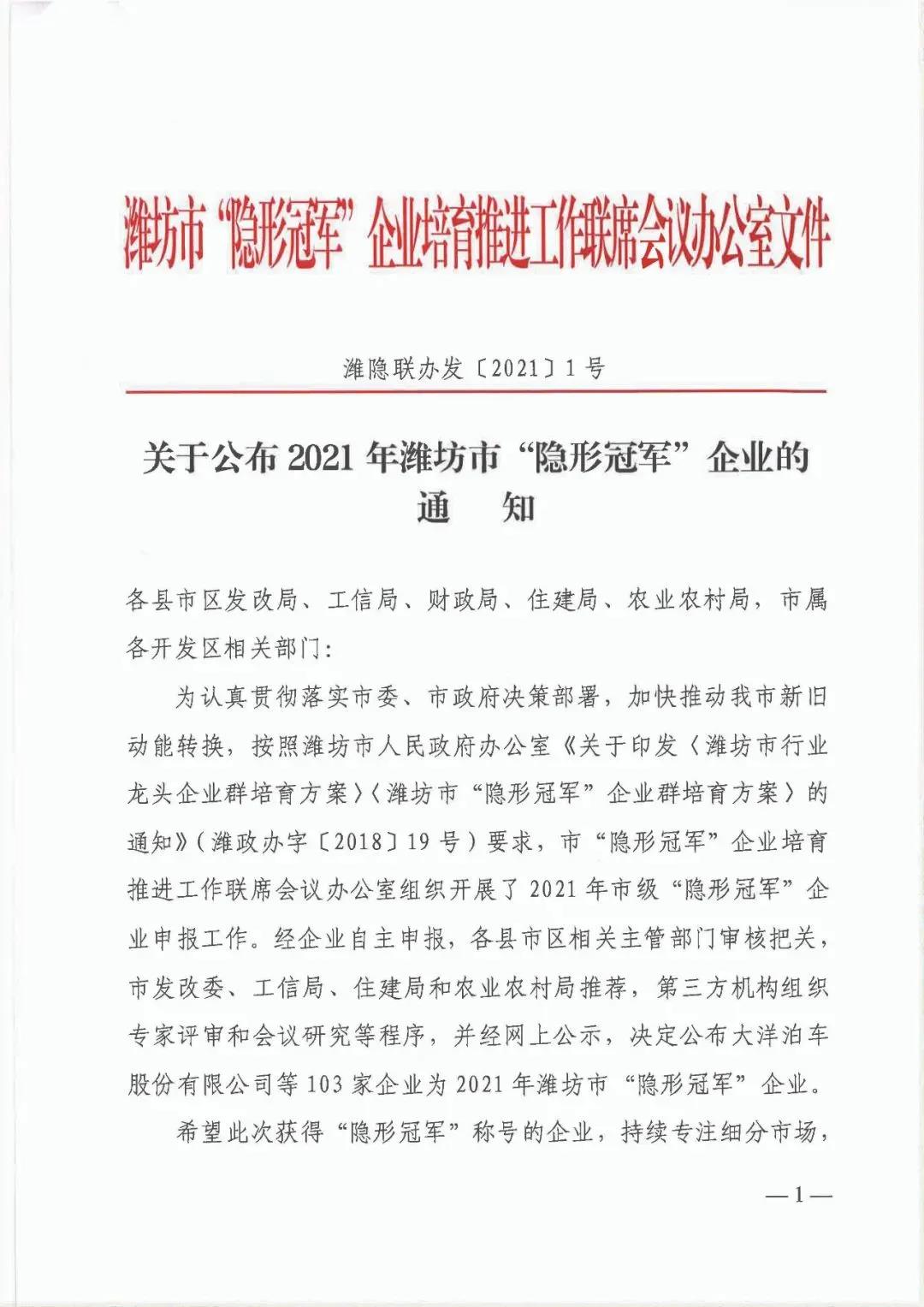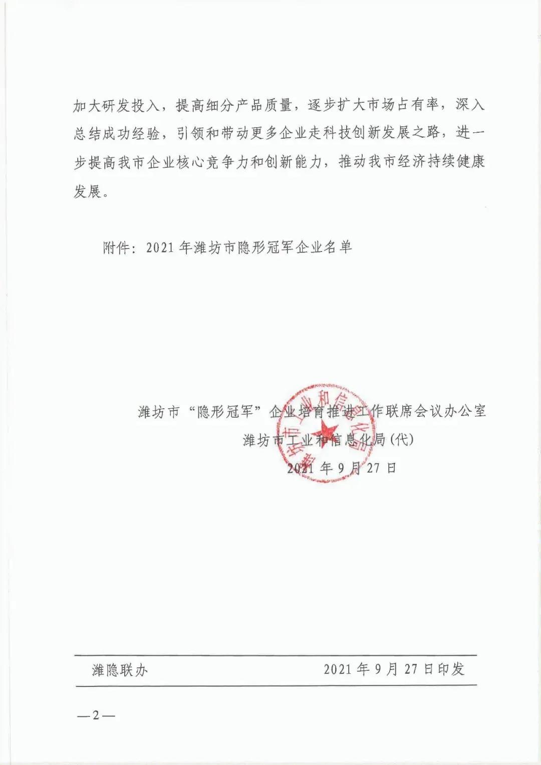 經企業自主申報,各縣市區相關主管部門審核把關,市發改委、工信局、住建局和農業農村局推薦,第三方機構組織專家評審和會議研究等程序,并經網上公示,中孚藥業股份有限公司被認定為2021年濰坊市“隱形冠軍”企業。