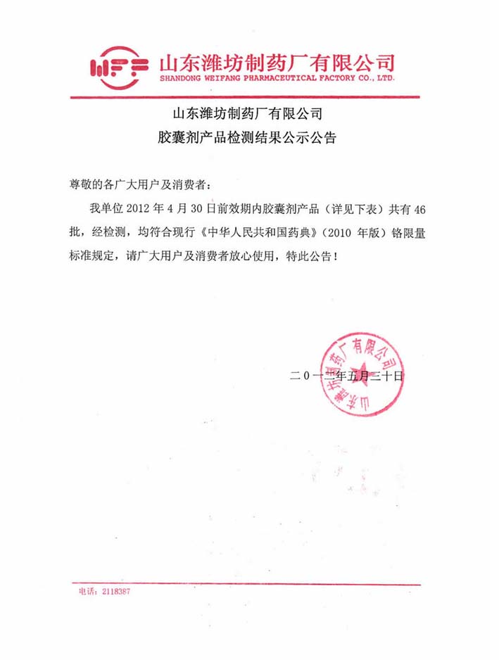 山東濰坊制藥廠有限公司膠囊劑產品檢測結果公示公告
