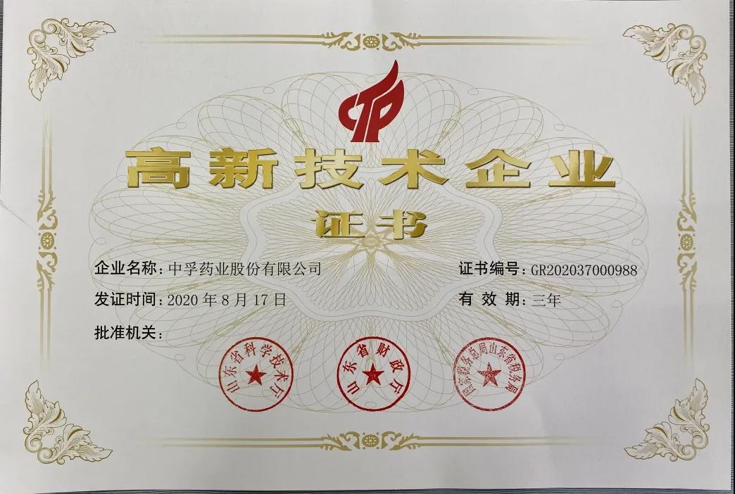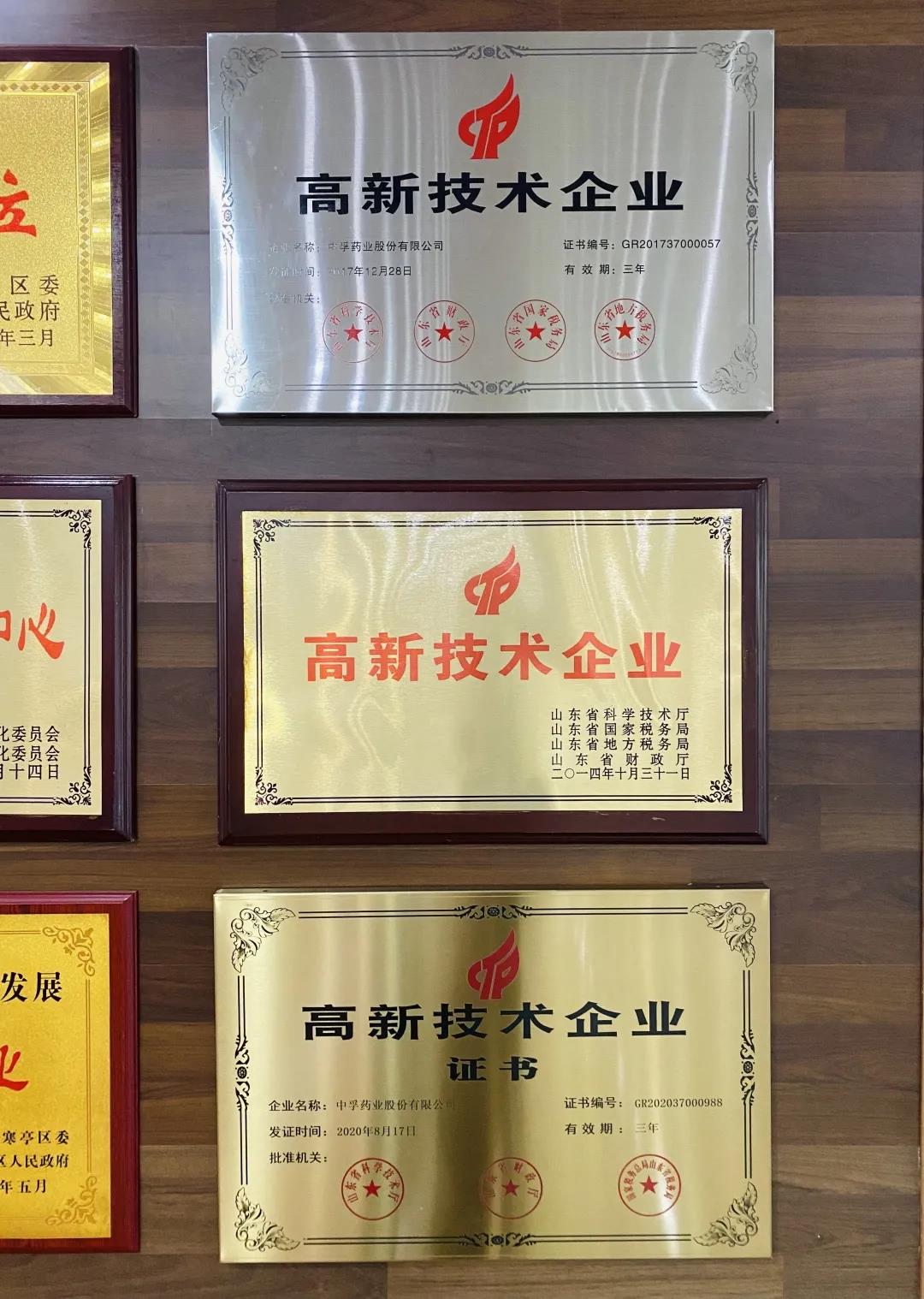 從2014年至今,中孚藥業一直連續多次榮獲“國家高新技術企業”認證,本次又成功通過復認定。根據國家高新企業認定條件,企業必須在核心知識產權、科技研發創新能力、高新技術產品成果轉化能力、成長性指標和人才結構等八個方面綜合達到要求,才能通過認證。這不僅是一種榮譽,更是一種責任,本次高新技術企業證書的獲得,是對中孚藥業股份有限公司創新研發管理水平、產品技術含量、成果轉化能力、成長性、質量保證的充分認可,也是對中孚藥業多年來堅持技術創新的有力詮釋。